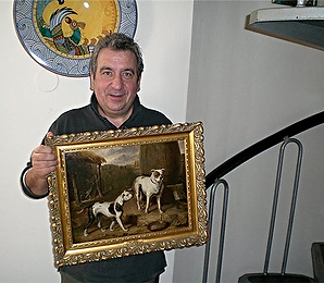 В 1585 году A. Hondius написал картину маслом на дубовой доске (впоследствии эта картина перешла во владение мистера Франка Эдкока), на которой были изображены два сторожевых пса, нападающие на дикого кабана в ложе неглубокой речки. У одного из них был коричневый окрас и черная морда, другой был белым, с пестрыми ушами; уши у обеих собак «торчали» кверху, а хвосты были длинными и тонкими. На вид каждая из собак весила от 100 до 120 фунтов (45-54,5 кг). Коричневая собака крепко вцепилась в левое ухо кабана.